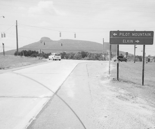 “Pilot Mountain” refers not only to a very real town, but to the very real and very unusual geological landmark nearby that dominates the landscape for miles around. Pilot Mountain is a quartzite monadnock [a huge knob] rising to a peak of 2,421 feet above sea level, and one of the most distinctive natural features of North Carolina. It is a remnant of the ancient chain of Sauratown Mountains, with its original Native American name being Jomeokee, for “great guide” or “pilot”. And I doubt any biker who’s ever ridden to Sturgis could long look at that omnipresent anomaly without in some small way being reminded of the Devil’s Tower in Wyoming.